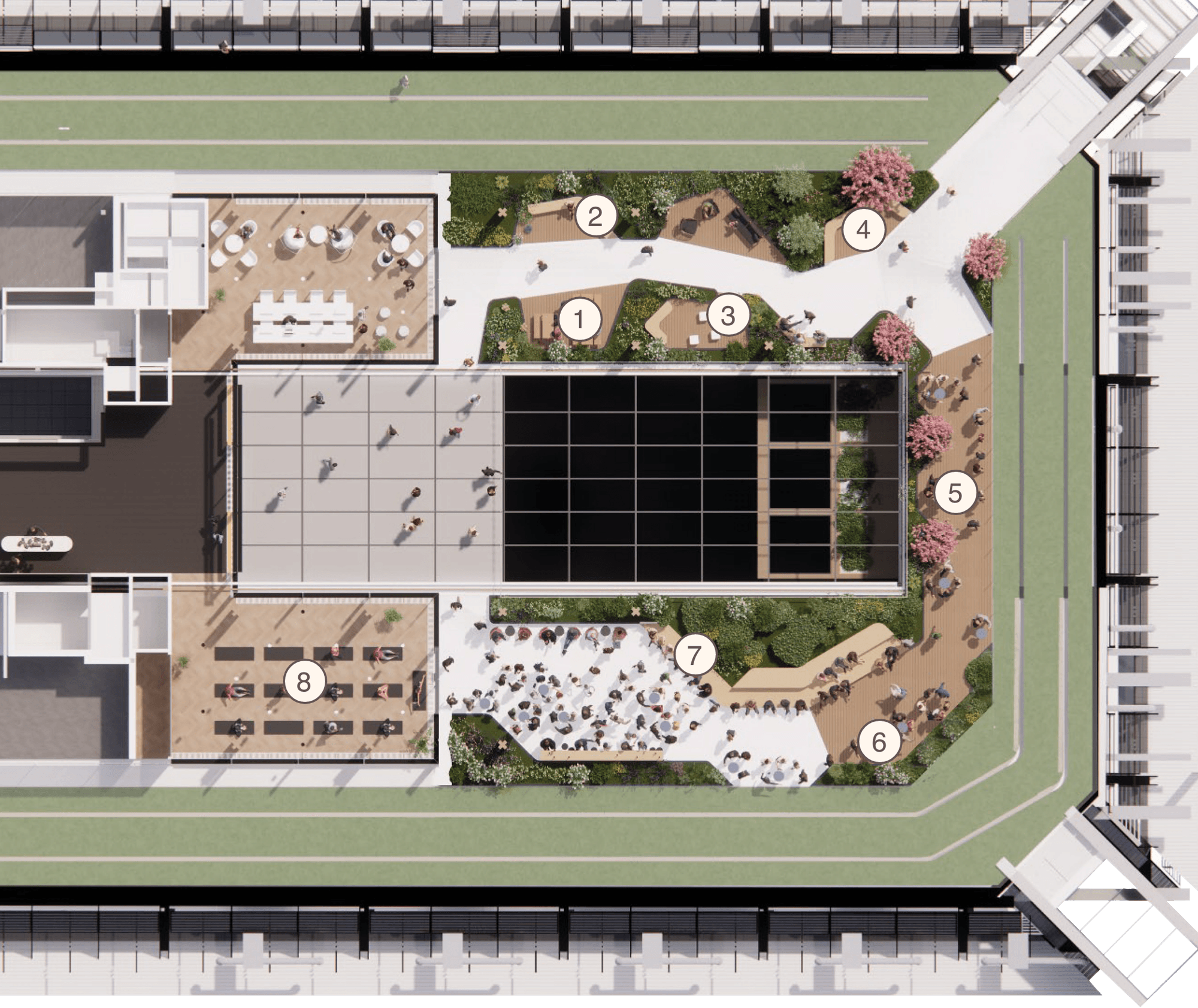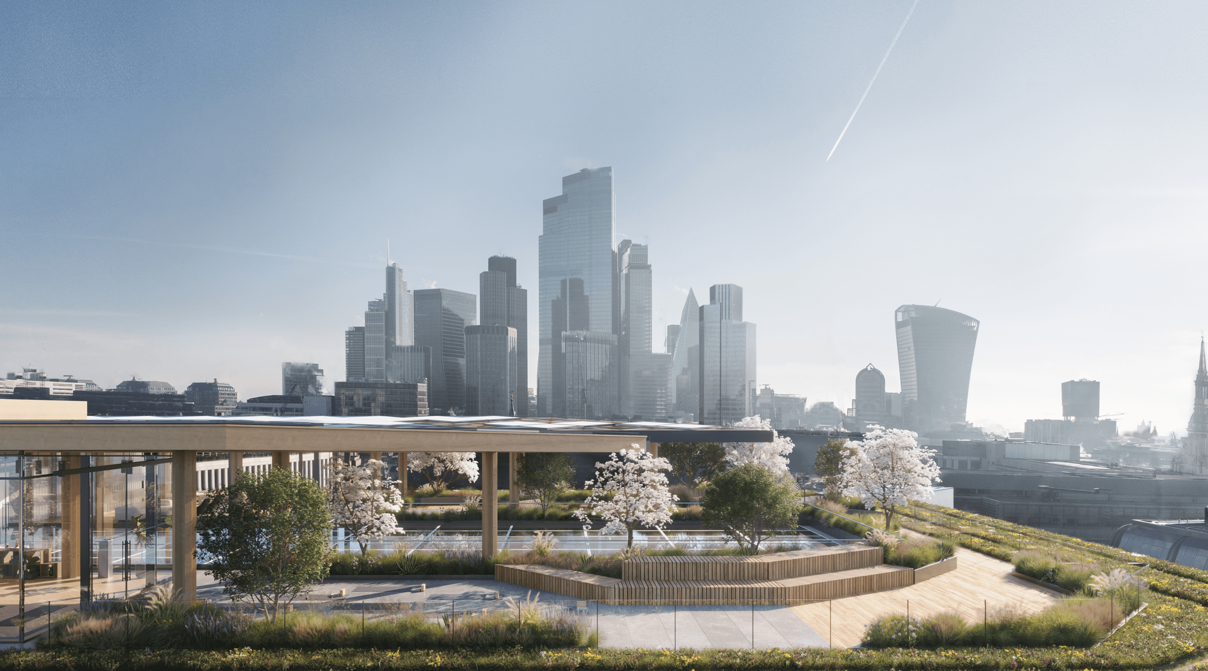 Experience panoramic views across the City of London and beyond from the reimagined roof terrace. Made with a mass timber structure, the pavilion provides a space for informal working, events and wellness activity.